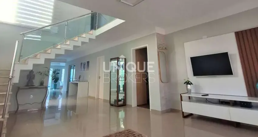 A área social conta com sala de estar aconchegante com lareira, sala de jantar elegante, jardim de inverno que traz luz e charme ao ambiente e escritório no térreo, perfeito para home office. A cozinha é funcional e integrada, com acesso à área gourmet coberta e totalmente fechada, ideal para receber amigos e familiares.