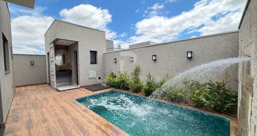Casa terrea, muito bem e localizado, proximo a area Kids do condominio! Sao 168 m2 de construcao muito bem distribuidos. Sala com pe direito alto, muita iluminacao natural, cozinha integrada com varanda gourmet, iluminacao, completa em armarios, 3 suites sendo a master com closet, agua quente fria em todos os ambientes, box, espelhos, lavanderia, vestiario extremo, piscina de pastilha com cascata, garagem para 4 carros, lavabo interno, escritorio, preparacao para fotovoltaica, projeto arquitetonico riquissimo em detalhes!