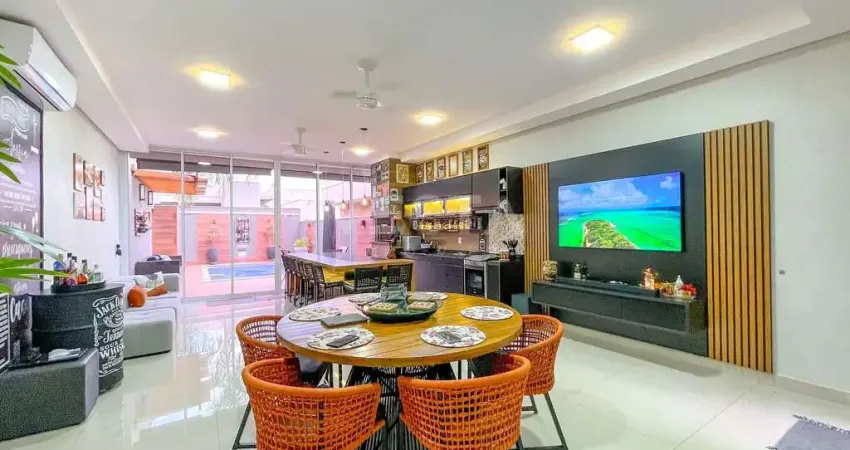 Casa térrea no condomínio Recanto do Lago, com ambientes amplos e bem distribuídos. Conta com três suítes, sendo a master com closet e hidromassagem. A sala possui pé-direito alto e climatização, proporcionando amplitude e conforto. O lavabo atende a área social, enquanto a cozinha é separada e equipada com armários planejados. A lavanderia possui armários e há ainda despensa e banheiro externo para apoio.