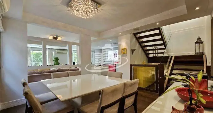 Destaques do Imóvel: 3 dormitórios, sendo 1 suíte máster com closet e banheira, Banheiro social e lavabo, Sala de TV, sala de estar para 2 ambientes e sala de jantar integrada, Cozinha planejada com forno, cooktop, coifa e armários sob medida, Quintal com vista verde, perfeito para lazer e descanso, Área de serviço com dependência completa, 3 vagas de garagem e ar-condicionado em todos os ambientes