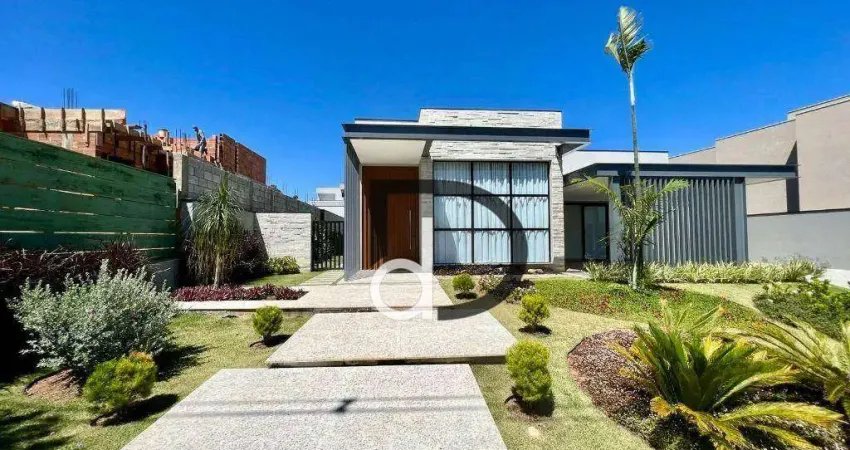 Casa térrea nova com arquitetura moderna em condomínio de alto padrão com com luzes de led, persianas blackout automatizadas, home theater, conceito aberto, área de serviço, 3 suítes com closet, área gourmet em ilha integradas á piscina, ar condicionado em todos os ambientes, churrasqueira a gás, amplo living para 3 ambientes com pé direito duplo, amplo deck de madeira, acabamentos em mármore granito, móveis planejados (Bom Tempo), piso Portobello, cortinas, porta social com senha eletrônica, filtro residencial, todos os box de vidro com porta de correr, aquecedor solar, boiler de 500 l., paisagismo.