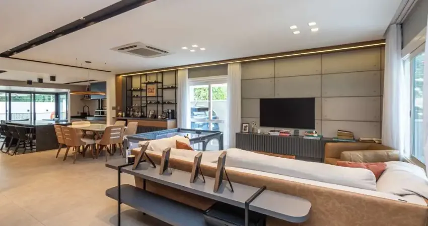 Living amplo com ambientes integrados, lareira, móveis planejados, cozinha finamente decorada, espaço gourmet com parrilla.