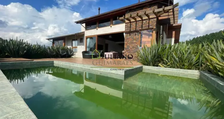 A casa contém, 3 dormitórios - sendo um suíte com jacuzzi, 2 banheiros, 1 lavabo, sala e cozinha integradas, área de serviços, sacada, piscina, ar condicionado, lareira e fogão a lenha.