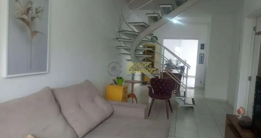 Sobrado em condomínio fechado com 3 quartos sendo 1 suíte, sala de TV e sala de jantar, cozinha, 2 banheiros sociais, quintal, área de serviço e garagem com vaga para 2 carros.