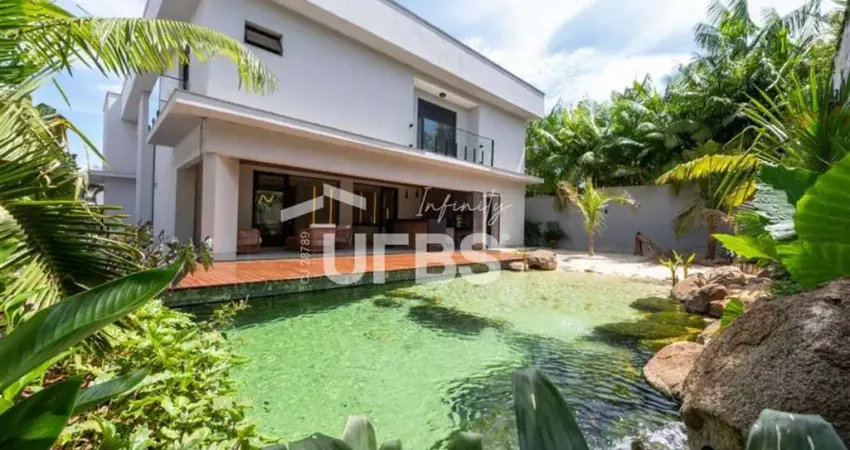 COD U-0028597 - Sobrado Mobiliado no Jardins Munique Lindo sobrado mobiliado está à venda no Jardins Munique. São 450 m de construção e 650 m de lote. O imóvel possui 04 suítes plenas sendo 2 máster com amplo closet e varandas além de sala íntima todas no pavimento superior. A sala principal é ampla com 2 ambientes e pé-direito duplo com lavabo escritório e home cinema isolado. A cozinha é toda integrada à sala e à varanda com grande bancada de ilha gourmet com cooktop e coifa além de torre quente com fornos embutidos. A área de serviço é toda isolada com estendal de roupa. A casa possui excelente acabamento com piso bancadas e pedras de altíssimo padrão completa em armários planejados aquecimento solar para água e piscina projeto de iluminação em led climatização em toda casa com ar-condicionado splits automação das persianas das salas e quartos vendida toda mobiliada e equipada e paisagismo com irrigação automatizada. O lazer é um espetáculo à parte com um oásis ornamental Ecosys piscina com areia cascata e pedras naturais estilo lago deck de madeira e varanda gourmet com churrasqueira à carvão com banheiro de apoio. Possui 4 vagas todas cobertas. - Informações Atualizadas em Um de janeiro Dois Mil e Vinte e Seis