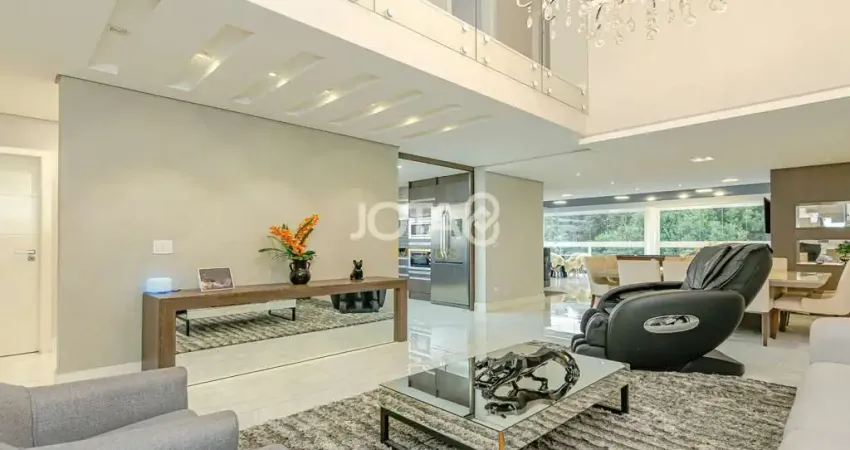 A planta bem distribuída contempla 4 dormitórios, sendo 2 suítes e uma demi-suíte. A suíte principal possui closet e uma ampla sacada com vista livre. Os espaços sociais são generosos e acolhedores: sala de estar com pé direito duplo, sala de TV e jantar totalmente integradas ao espaço gourmet, ideal para receber amigos e familiares com muito conforto.