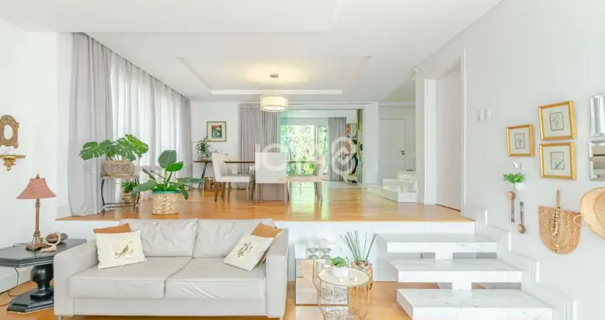 No térreo, temos ambientes integrados entre sala de estar, jantar e churrasqueira, além do lavabo, cozinha, área de serviço, depósito e uma área externa. Garagem para quatro carros, sendo dois cobertos.