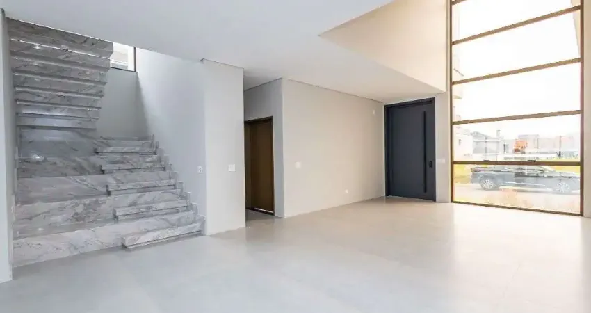 Casa nova, pronta para morar, à venda, São Braz, com 290 m² privativos, 4 suítes, sala de estar com mezanino, pé direito duplo, sala de jantar, área de serviço, lavabo, cozinha gourmet com churrasqueira, preparo para geração de energia fotovoltaica, aquecimento solar, área externa com jardim e quintal, no Condomínio Harmony Village.
