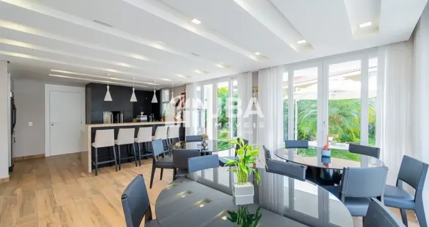 - Amplo salão de festas mobiliado e decorado com uma bela churrasqueira, mesas, cadeiras, armários com portas em vidro, geladeira, sala de TV com lavabo, ligando ao belo quintal com vista para a piscina;