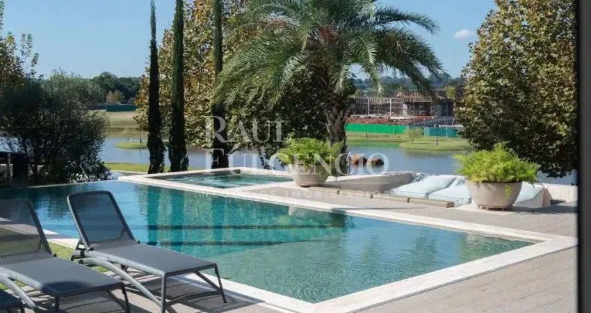 The Euro Royal - Imponente casa com 788m2 de construcao em um terreno de 1418m2 extremamente bem localizado em frente ao lago e a area de lazer do condominio; pisos e revestimentos de toda area social em marmore, ampla area gourmet climatizada com sistema de som embutido, piscina e 'spa' aquecidos com vista p/ o lago e anexos ao 'fireplace', sala de estar e sala de TV com pe direito duplo e iluminacao/ventilacao naturais de ambos os lados, 'jardim de inverno' com espelho d amp;#39;agua e cascata, cozinha com copa anexa; Elevador p/ 6 pessoas com acesso aos 3 pavimentos; area intima no pavimento superior toda com assoalho em madeira, 4 suites sendo 1 master com generosa varanda e 'fireplace' com vista p/ o lago; Cortinas e persianas automatizadas; home office; loucaria, garagem coberta p/ 4 veiculos estacionados paralelamente.