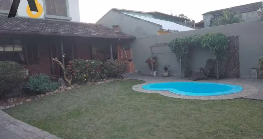 1- Pav. Varandão frontal diante de um imenso quintal todo gramado, contendo uma piscina e vagas para 3 carros, edificção no centro do terreno - Sala de estar toda em estilo colonial, com predominância em madeira, 1 lavabo, Copa cozinha com armários, saindo para área de serviço e dispensa.