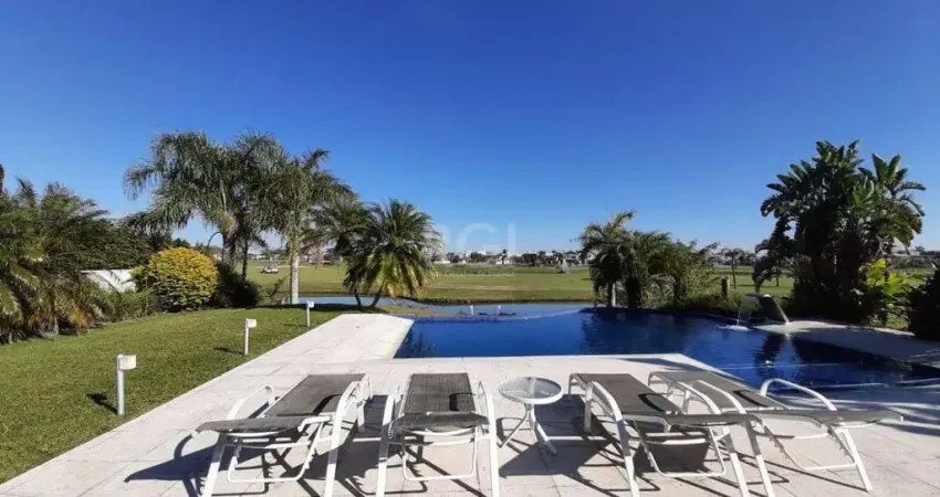 A sacada do andar superior, com suas linhas sinuosas, interliga os dormitórios, e desvenda uma vista deslumbrante para os lagos e campo de golfe, além do belo jardim com piscina aquecida.