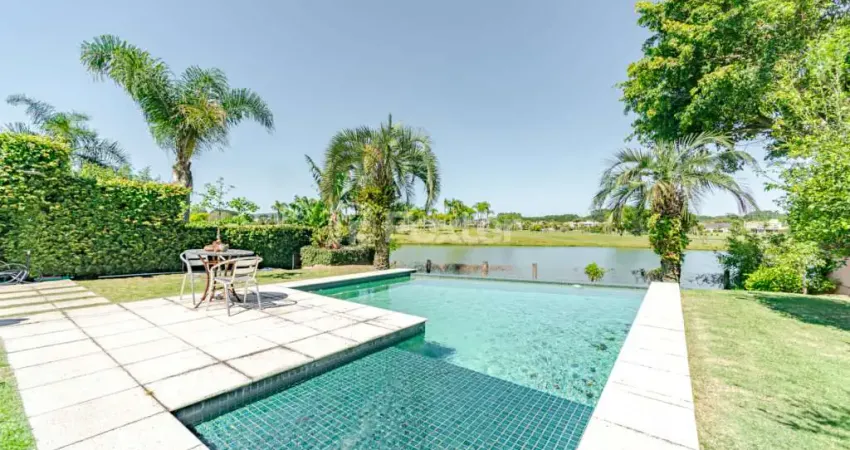Belíssima Residência no condomínio Terraville com 341 m² privativos, perfeita para quem busca exclusividade e contato com a natureza. São 4 suítes espaçosas, sendo uma master, living com lareira, estar íntimo, espaço gourmet e dependência completa. A área externa impressiona com piscina de borda infinita, deck privativo e fundos para o lago (possibilidade de pier0, além de vista deslumbrante para o campo de golfe. Tudo isso dentro de um condomínio onde você pode desfrutar com sua família de um clube, quadras de tênis, golfe, restaurante e segurança 24h. Agende sua visita!