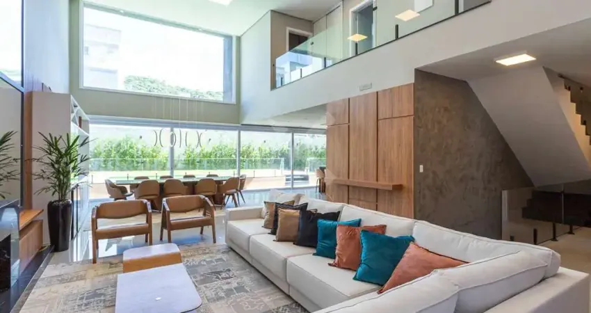 O Imóvel possui 04 suítes já com móveis planejados, sendo uma delas no térreo, todas com persianas automatizadas, lindo lavabo, lareira, living amplo com 02 ambientes integrados com a ilha da churrasqueira, espera para chopeira e cozinha completa em conceito aberto.