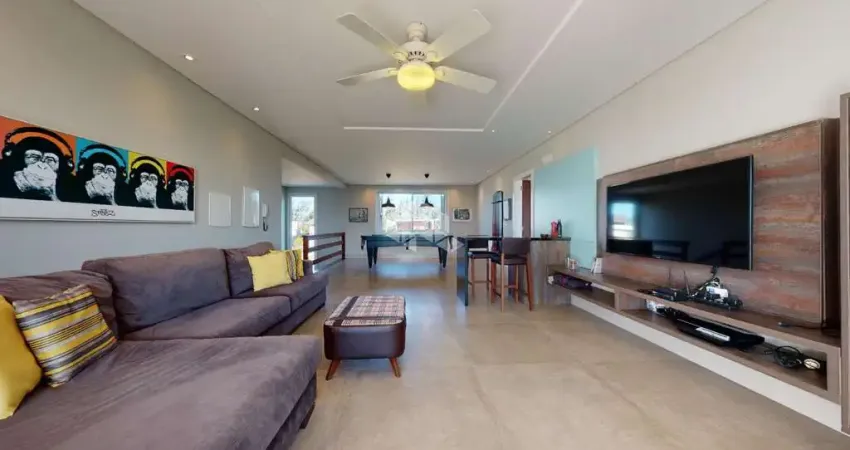 Com uma área total de 459,62 m², o imóvel conta com um amplo living no térreo, equipado com lareira revestida em madeira, lavabo e uma sala de jantar que acomoda até 12 pessoas. A área gourmet é integrada e possui uma parrilla uruguaia, ideal para momentos de confraternização. A suíte master, com 32 m², oferece um espaço aconchegante e privativo, enquanto a cozinha fechada e a área de serviço com dependência de empregada completa garantem praticidade no dia a dia.