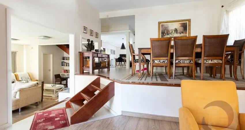 Linda casa residencial com 341 m² de área construída, sendo 195 m² averbados na matrícula, com 4 dormitórios, sendo 4 suítes, água quente, ar condicionado, área de serviço, armários embutidos, banheiro de serviço, banheiro social, churrasqueira, copa, cozinha americana, escritório, espera para split, estar íntimo, lareira, lavabo, living, quintal, sacada, piscina, sala de jantar, sala de TV, semimobiliado, teto rebaixado e 5 vagas de garagem.