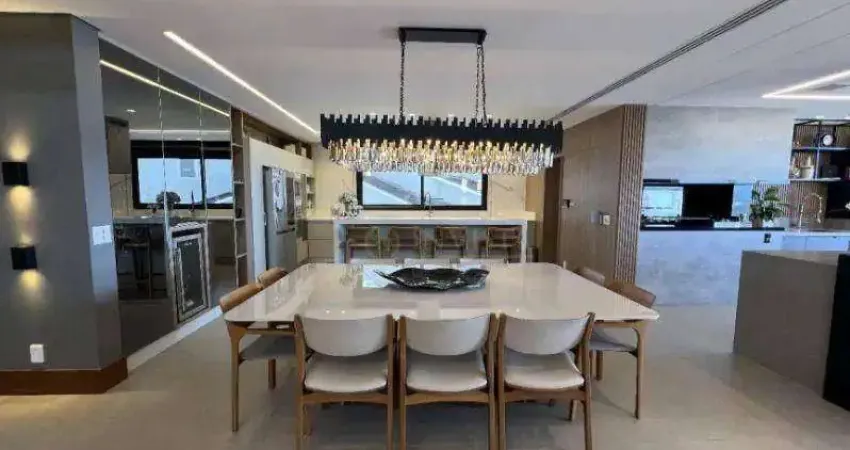 A área social integra salas de estar e jantar, seguida pela cozinha americana e pela área de serviços. No eixo íntimo, são 4 suítes, incluindo 1 suíte máster com closet e hidromassagem, além de banheiro social e lavabo.