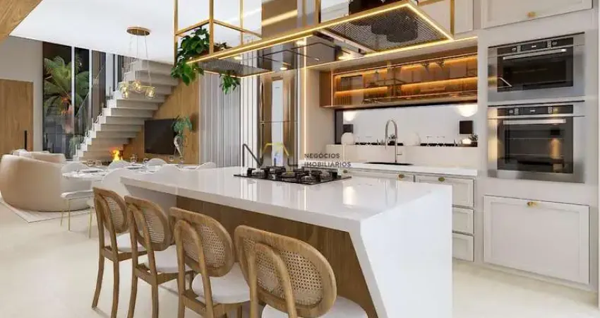 Com 4 dormitórios, (sendo 1 suíte na parte de cima e 1 domitório na parte de baixo reversivel para escritório), possui 3 banheiros, 4 vagas de garagem (sendo 2 cobertas), sala 2 ambientes, área gourmet, infraestrutura para energia fotovoltáica, aquecimento da agua através de placas solares, ar condicionado, acabamentos de primeira linha, esquadrias premium.