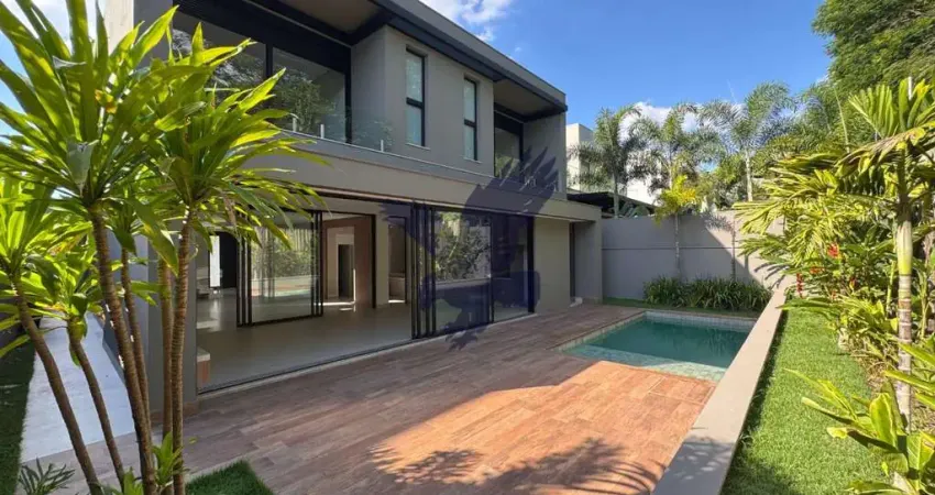 Residência contemporânea recém construída, entregue com acabamentos de alto padrão, contendo quatro suítes no piso superior, todas com varanda (a master com closet e banheira de imersão), além de roupeiro e sala íntima. Piso inferior contém despensa, área de serviço, wc/serviço, living para dois ambientes com lareira, integrado com cozinha planejada, lavabo, escritório/home theather e varanda gourmet, vestiário de apoio e piscina com deck e prainha. Garagem para quatro veículos, sendo duas cobertas. Pets permitidos.