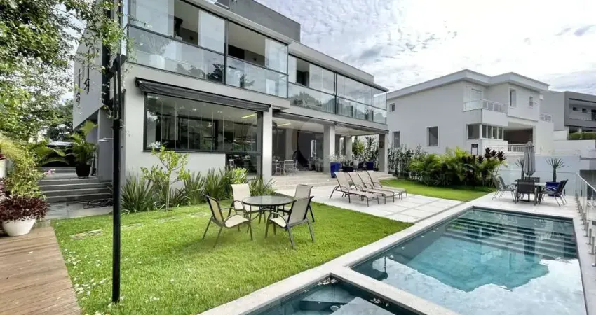 PORTEIRA FECHADA! Linda casa moderna maravilhosa integrada. Com 4 suítes e excelente acabamento. Voltada para APP - Área de Preservação Permanente com muita privacidade. Elevador panorâmico, para 2 pessoas (200 Kg). Jardim com paisagismo. Imóvel repleto de armários. Portas e janelas em alumínio e vidro, com persianas elétricas nos quartos. Pisos em porcelanato, pedras e fulget . Louças e metais Deca. Projeto de gesso e iluminação. 3 acessos: social, garagem, lazer e serviço. Hall de entrada social imponente por uma porta pivotante, com aparador e grande espelho. Lavabo decorado com tampo em mármore e espelho. Escritório com acesso independente pela garagem. Escada de alvenaria iluminada, revestida em granito rústico com guarda corpo de vidro. Hall íntimo | Family room com elevador no piso superior. Um espaço multiuso ideal para home theater, jogos, escritório, estudos, academia, com grande varanda fechada envidraçada. 4 suítes com armários e ar condicionados. Sendo 3 com closets, 2 suítes com terraços e 2 com varandas. A master com closet sr e sra. Banheiros com tampos em resina, espelhos, gabinetes, box de vidro e nichos. Sendo a máster com 2 cubas, 2 duchas e hidro dupla panorâmica. Living imponente com pé direito duplo e grandes espelhos para 6 ambientes integrados, voltados para varanda gourmet, quintal com piscina e jardim. Estar, TV, lareira gás, jantar, bar e cozinha totalmente integrada. Varanda gourmet para 3 ambiente com 2 grandes toldos retráteis, churrasqueira, bancada, pia inox, gabinetes e balcão. Totalmente voltada para APP - Área de Preservação Permanente. Piscina de alvenaria adulto e infantil iluminada, revestidas com pedras Hijau, aquecida - trocador de calor, prainha, escada interna, hidro, grande solarium com guarda corpo de vidro e piso antiderrapante. Cozinha envidraçada com sala de almoço, totalmente integrada ao living e ao gourmet, repleta de armários planejados, ilha com fogão 5 bocas e coifa inox, tampos em resina, 2 cubas inox e despensa. Área de serviço aberta ensolarada e lavanderia fechada com tanque e armários. Depósito e casa de máquinas. Garagem para 4 vagas, sendo 1 cobertas. Aquecimento: Solar com suporte elétrico e gás. - Ref.: REO1083736
