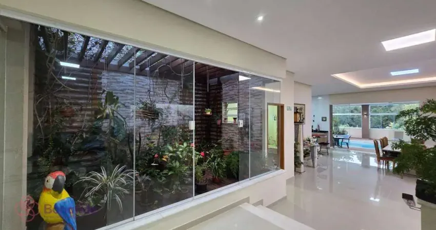 Piscina aquecida e coberta, jardim interno, banheiro, academia com ar condicionado, lavanderia com armários, quarto de empregada, canil, porão, pomar com arvores frutíferas e um poço, jardim lateral, portão eletrônico com câmeras, 3 caixas d água com pressurizador, aquecedor solar na casa e piscina.