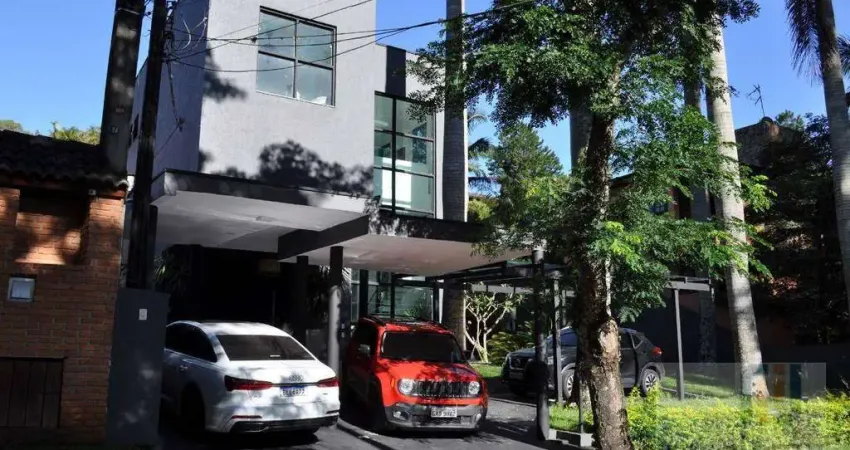 Casa para venda no Condomínio Residencial Nova Higienópolis, em Jandira. Conta com 3 suítes, 1 delas com closet e varanda, outra com guarda roupa embutido, ar condicionado em todos os dormitórios, sala de jogos, corredor largo, sala de estar com pé direito duplo, lavabo, cozinha com móveis planejados, toda em mármore e ilha central, sala de jantar (conceito aberto tanto para a cozinha quanto para o quintal), lavanderia com armários embutidos, despensa, corredor em volta da casa, área gourmet, piscina adulto e infantil com iluminação colorida em LED, vestiário, canil com 3 baías, 3 vagas cobertas de garagem, jardim, totalmente iluminada e maior parte em vidros.
