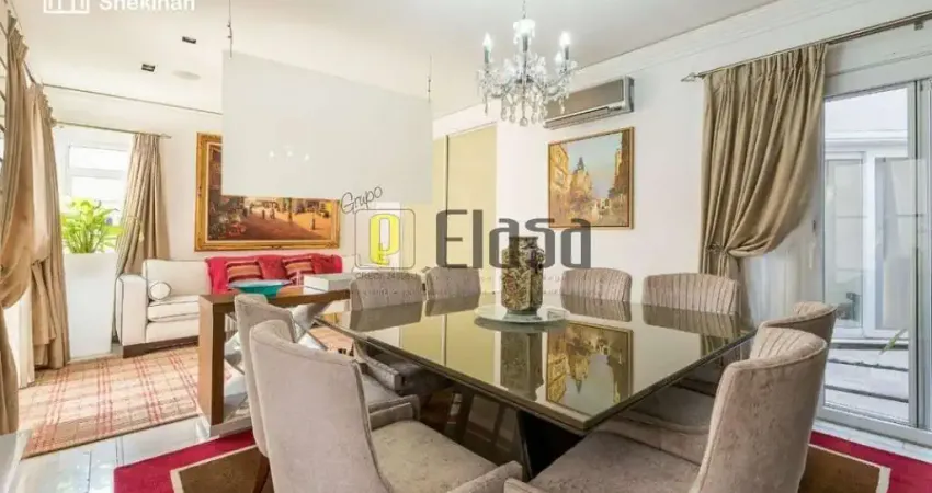 Sobrado com 3 pavimentos, térreo com área externa com piscina com deck, varanda gourmet, churrasqueira, área interna com copa e cozinha com armários planejados Elgin, sala de jantar, lavabo, sala de estar com lareira, sala de tv. Primeiro pavimento com 4 suítes, todas com armários embutidos, ar condicionado, sendo a master com closet, banheiro com 2 bancadas e hidromassagem, antessala com roupeiro. Subsolo com garagem para 8 carros, lavanderia com armários planejados, quarto e banheiro de serviço, mais 2 depósitos.