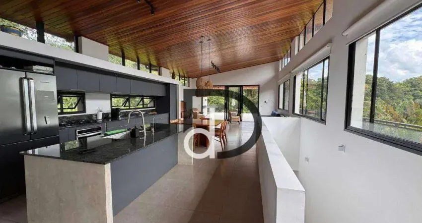 Com 293 m² de construção e 1757 m² de terreno, tem construção nova, com uso de madeira nobre, muito bem arejada e iluminada naturalmente. Em formato de sobrado invertido, em seu primeiro andar conta com ampla sala de pé direito elevado e forração em Peroba Rosa, espaço para 3 ambientes com cozinha integrada com ilha, planejados e toda equipada, abertura total ao fundo para a varanda gourmet e verde. Além disso, uma suíte revertida em escritório. A varanda gourmet tem pergolado, bancada e amplo terraço para uso diverso. Abaixo, uma sala de TV e mais 3 suítes, armários no corredor e em todos os ambientes. A casa conta com geração de energia fotovoltaica para 750 kw, boiler, persianas automatizadas e mais.