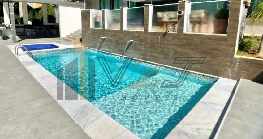 Pavimento térreo: 2 suítes, sendo 1 master, rica em armários embutidos, sala de lareira com pé direito duplo, home theater com iluminação em LED, bar, cozinha aberta podendo ser fechada, espaço zen, área gourmet com churrasqueira interna e externa, varanda com vista para a mata, piscina com spa e cascata, forno industrial de pizza, lavabo, quintal, lavanderia, despensa, suíte de funcionária, atelier, garagem para diversos carros, casa de esquina com paisagismo e guarda corpo em vidro.