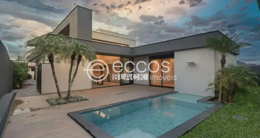 Casa com projeto em estilo moderno, localização privilegiada; instalação fotovoltaica de 505W; projeto luminotécnico interior e exterior; marcenaria completa em armários; acabamento de alto padrão; piscina com cascata e paisagismo maravilhoso; com 04 suítes, todas com ar condicionado, sendo uma master com amplo closet, janelas com venezianas automatizadas, ar condicionado e piso vinílico; banheiros amplos, com box e bancada; espaço gourmet; ampla sala para dois ambientes, com piso em porcelanato; lavabo; cozinha estilo americana e copa integrada; área de serviço; quarto de serviço e lavabo. Condomínio composto por salão de festas, 4 quadras de tênis e academia.