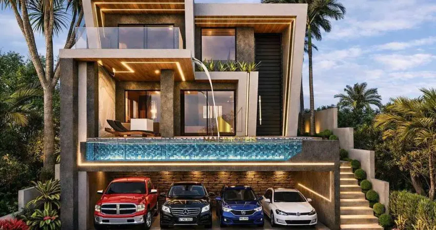 A casa conta com elevador, garagem coberta para 4 carros e ambientes amplos e integrados. A sala de estar é integrada à sala de jantar e à cozinha, proporcionando excelente iluminação natural e fluidez nos espaços. A área externa oferece piscina com borda infinita, área gourmet completa com telão, ideal para receber amigos e familiares.