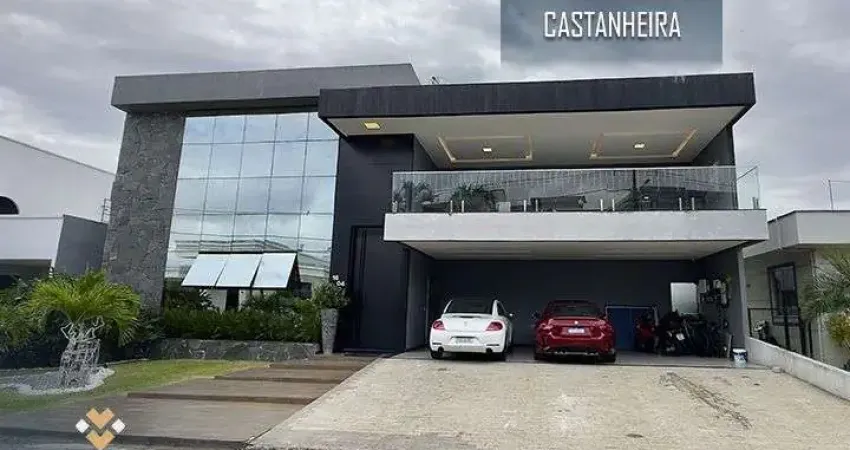 A área interna é distribuída de forma funcional, com sala de estar e jantar integradas, aproveitando a excelente iluminação natural, e cozinha espaçosa. O piso em porcelanato percorre toda a casa, reforçando o acabamento de alto padrão. O imóvel está situado em um dos condomínios mais valorizados da cidade, próximo ao Shopping Castanheira, e conta com segurança externa.