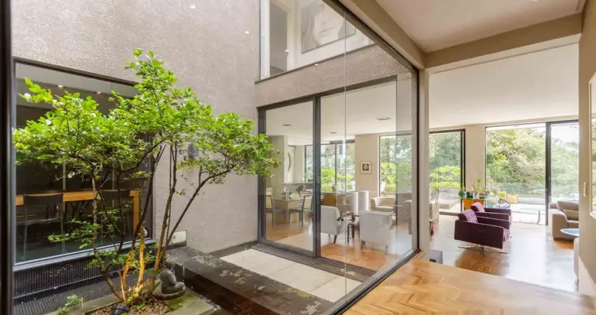 Em um terreno de 688 m², esta casa foi projetada para valorizar a luz natural e o convívio com o entorno. O piso em madeira maciça cumaru reveste todos os ambientes internos, e o jardim de inverno com fonte de água, localizado no centro da casa, conecta os espaços com harmonia e energia. A área social é totalmente integrada, com salas para vários ambientes, espaço gourmet com churrasqueira a carvão, cozinha espaçosa com despensa e uma deliciosa sacada com deck, jacuzzi e vista para o jardim.
