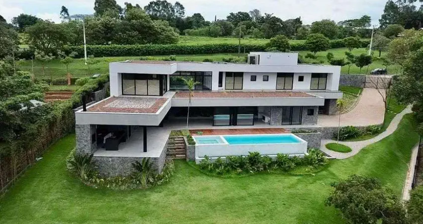 São 3.000 metros de terreno com total exclusividade em sua localização. Contendo uma vista panorâmica de 360°. Excelente casa com 5 suítes amplas, sendo 01 máster com hidro, sala intima com lareira e mezanino, sala ampla para 04 ambientes totalmente integrada com a casa por completa. Sendo elas sala de estar, sala de jantar, sala de home-theater, cozinha anexada com varanda gourmet em espaço espetacular integrando sua área recreativa de lazer, piscina em alvenaria com borda infinita, ofurô, lareira de chão, espaço zen em meio a natureza, adega. Terreno com acesso a área recreativa do condomínio.
