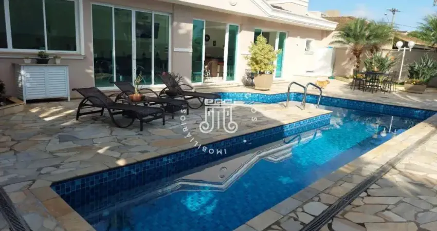 A casa está composta por: 5 Quartos, sendo 4 suítes, 2 suíte com closet, 1 suíte com closet, banheira e hall na parte com vista para a piscina; Hall de entrada com lavabo; Sala de estar com lareira; Sala de jantar; Cozinha ampla com ilha e área de serviço integrada; Escritório e Varanda.