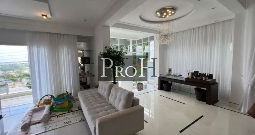 Na parte social, a residência impressiona pelos ambientes integrados e sofisticados, com sala ampla, lareira e excelente iluminação natural. A cozinha é planejada e funcional, harmonizando com os demais espaços da casa. O imóvel possui 560m² de área útil, quatro vagas de garagem cobertas e estrutura completa para quem busca alto padrão, conforto e exclusividade dentro de um dos condomínios mais desejados da região.
