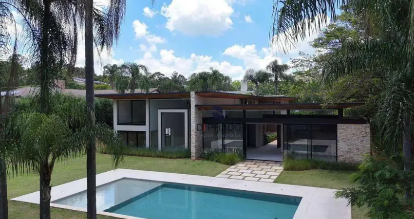 Casa à venda com fundo para área preservada do condomínio, 6 dormitórios todos suítes, com closet , sendo duas máster, home office, ar condicionado em todos os ambientes, lavabo, cozinha, adega espaçosa, espaço gourmet integrado, piscina com estrutura preparada para aquecimento, home theater, elevador, automação, energia fotovoltaica, aspiração central irrigação automática, energia solar, poço artesiano, suíte de funcionária, paisagismo.