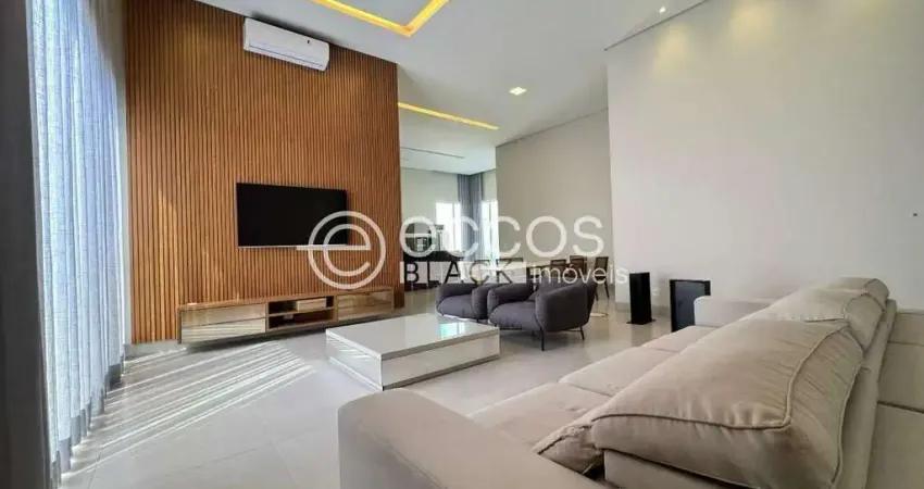 Casa em condomínio fechado na zona sul de Uberlândia, com área construída de aproximadamente 240 m² em um terreno de 410 m², composta por três suítes com armários, sendo a suíte máster com closet, ar-condicionado e cama de casal em todas as suítes; sala de visitas em dois ambientes com pé-direito duplo, integrada à varanda gourmet com churrasqueira e bancadas em granito, lavabo, cozinha com armários e bancada em granito, área de serviço com armários, banheiro externo, piso em porcelanato e garagem para quatro carros; casa mobiliada conforme fotos.