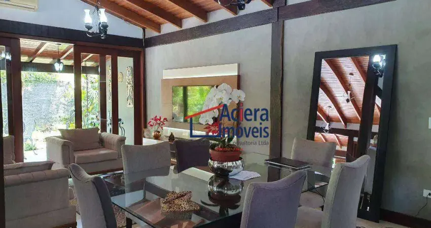 Casa térrea, semi-mobiliada com 3 suítes, sendo máster com hidro e closet, lavabo, salas de estar e jantar, varanda, copa, cozinha, lavanderia, suíte de empregada, área gourmet com churrasqueira e forno, piscina, sauna, vestiário .