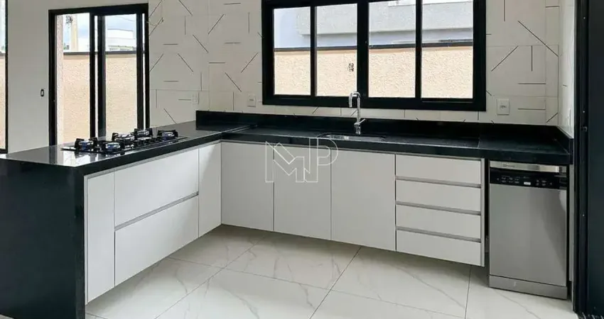 Casa térrea, com 3 suítes, sendo 1 suíte equipada com planejados, cozinha completa integrada com sala de jantar e sala de estar, pé direito alto, banheiros com armários e área gourmet.