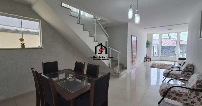 No andar superior, a casa conta com uma confortável sala de TV equipada com ar-condicionado, sacada e banheiro com box, proporcionando um espaço versátil que pode ser utilizado como área íntima ou de entretenimento. O imóvel dispõe ainda de três vagas de garagem, sendo uma coberta, garantindo praticidade no dia a dia.