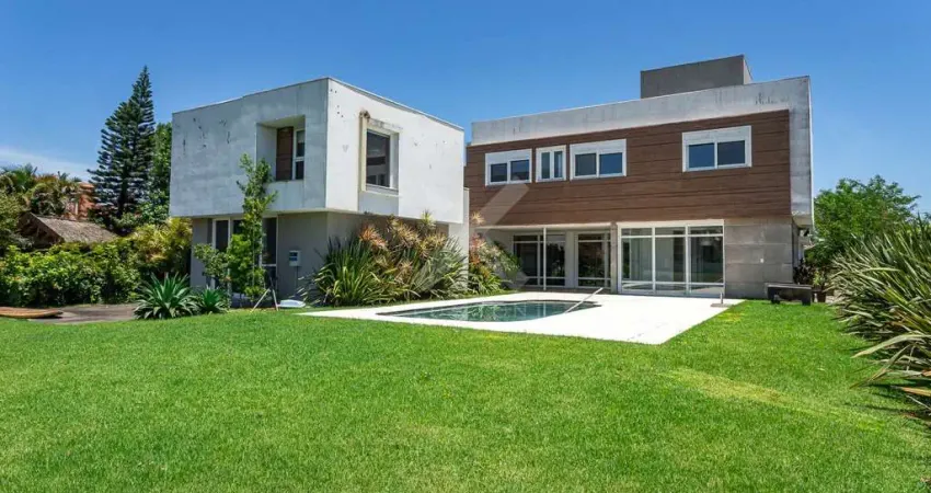 Amplo living com pé direito duplo, lareira, estar íntimo, área gourmet, fitness, office, estúdio com dormitório, banheiro e closet. Cozinha, lavanderia e dependência. Pátio com piscina e área de convivência voltado para o lago.