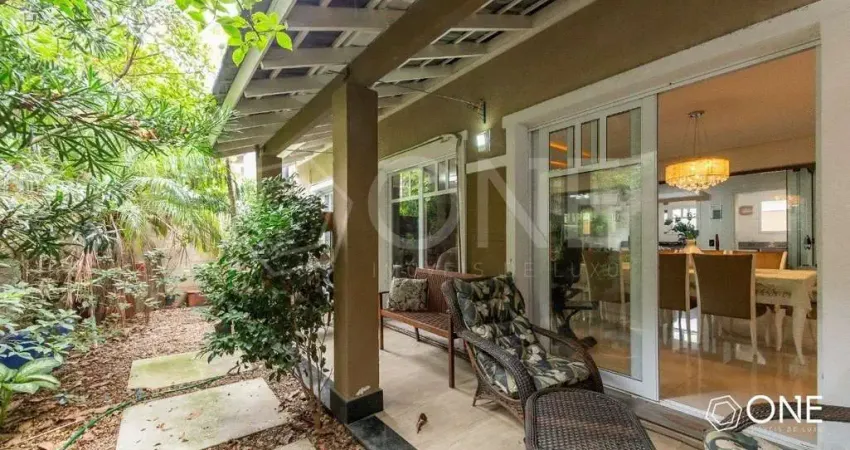Casa em condomínio fechado com 446 m² de área privativa, oferecendo 4 suítes e uma planta espaçosa ideal para famílias que valorizam conforto e integração com a natureza. O amplo living conta com lareira, estar e jantar integrados ao pátio com jardim, proporcionando iluminação natural e ventilação. O espaço gourmet com churrasqueira é perfeito para momentos de convivência. Conta ainda com lavabo, área de serviço e 4 vagas de garagem.