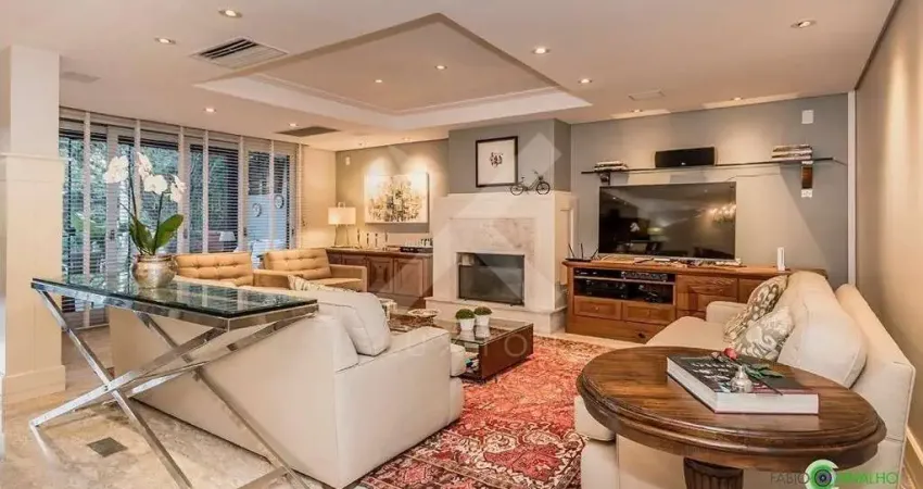 Casa em condomínio mobiliada com 3 pavimentos, totalizando com 520m². Imóvel conta com 4 dormitórios, 3 suítes, 1 master com closet e 2 banheiros, living de 5 ambientes, com lareira, e churrasqueira, sótão com configuração de escritório e amplo terraço aberto com jacuzzi. O primeiro pavimento conta com lavabo, adega, cozinha, área de serviço, dependência de empregada com banheiro, escada em tabuão, jardim de inverno com vista para praça e jacuzzi aquecida. No segundo andar estão localizadas as 3 suítes e no terceiro pavimento o sótão com espaço de escritório, sala de estar, copa e banheiro. Imóvel com 2 vagas de garagem cobertas e 2 descobertas.