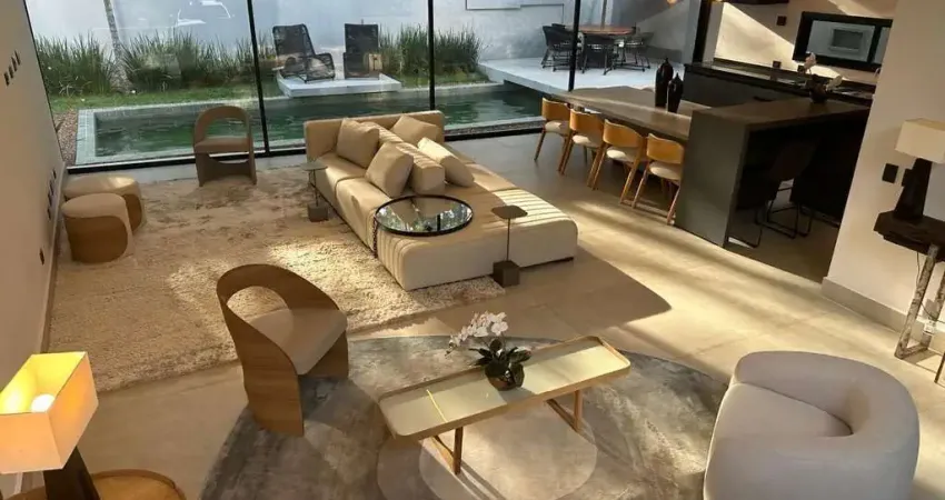 sala de estar e jantar integrada com área gourmet e cozinha.