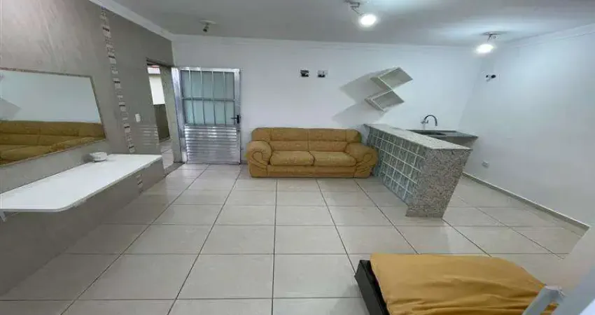 Estúdio aconchegante no Parque Bristol, com 18m² bem distribuídos. O imóvel conta com um dormitório integrado, banheiro, balcão que divide a cozinha, sofá, mesinha/prateleira, além de um espelho fixo na parede. Na cozinha é possível instalar armário. No dormitório há um espelho grande fixado, proporcionando mais amplitude ao espaço.