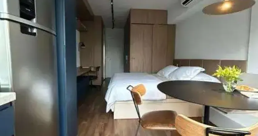 O studio na rua dos Pinheiros possui 30 m² , novo, super decorado, com muitos armários, ar condicionado, geladeira, fogão de indução, micro-ondas,