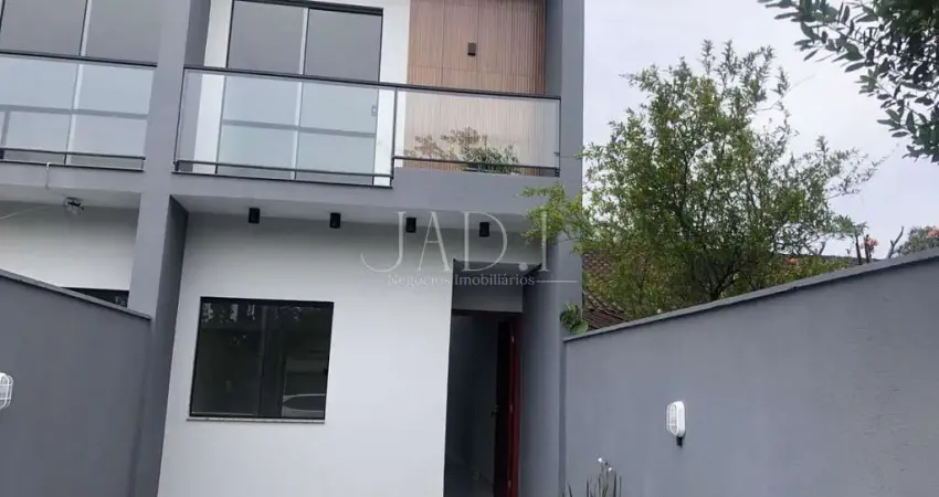 Casa nova, estilo sobrado para locação, com móveis de cozinha, banheiro e churrasqueira na parte externa com deck.