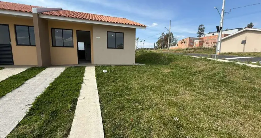 Casa nova em alvenaria, com sala de estar, cozinha, banheiro, 2 quartos, área de serviço, ampla área de terreno e vaga de estacionamento descoberta.