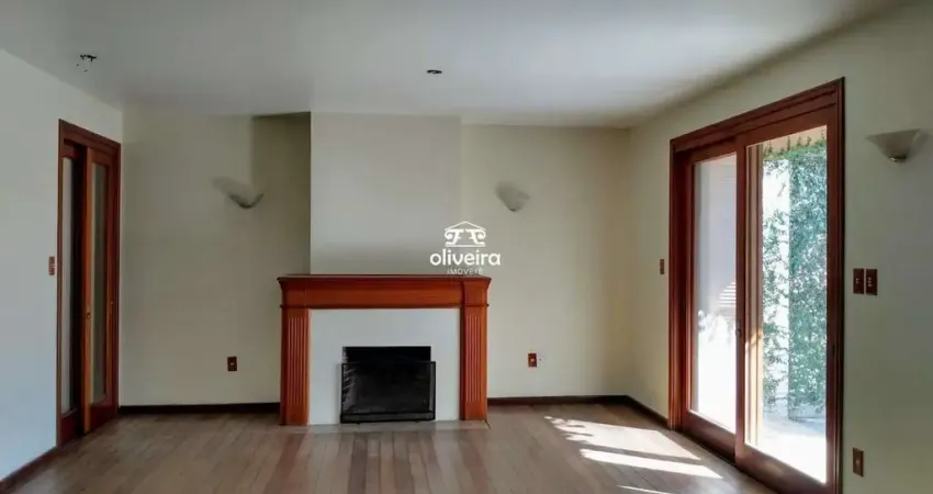 Casa para locação com sala equipada com lareira, ampla cozinha, três dormitórios, sendo uma suíte, e quatro banheiros. Esta espaçosa residência oferece conforto e elegância em todos os ambientes.